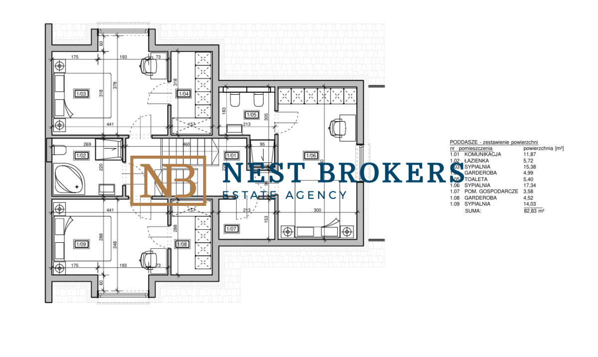 Łączna powierzchnia piętra: 82,83 m²