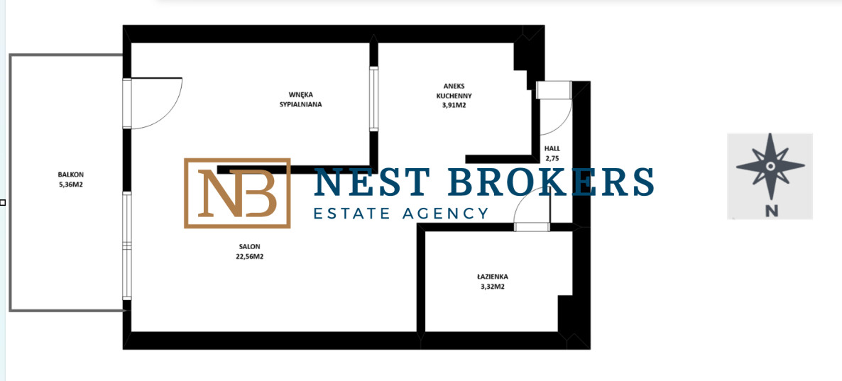 Salonu z wnęką sypialnianą: 22,56 m2